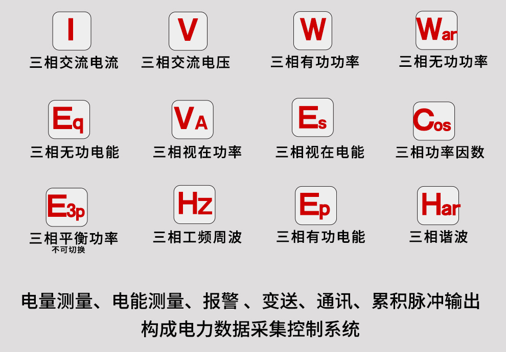 三相綜合電量表采用大規模集成電路和高亮度長壽命的LED顯示器,應用數字采樣技術,對三相電氣線路中的相電壓、線電壓、相電流、線電流、有功功率、無功功率、視在功率、頻率、功率因數、等進行實時測量顯示與控制。